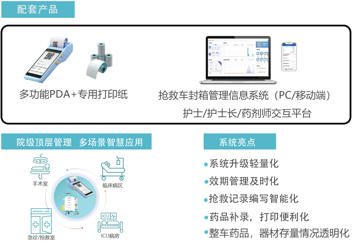 ✅智能“封箱”管理:通过为抢救车加装智能封箱装置(一车一码、一锁一码)并结合药品/物品的精细化管理(一物一码),实现对抢救车状态的智能化管控。